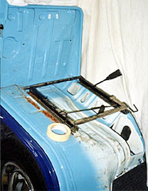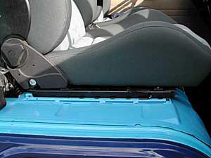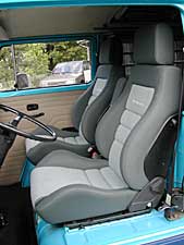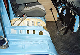 so sah das ganze nach vielen stunden arbeit aus, die sitzschienen sind eingeschweisst, das blech geschliffen und gespritzt. (oben li) die beiden sitze waren noch beim autosattler, welcher die sitzfläche um ca. 10 cm einkürzte um eine bessere beinfreiheit zu gewähren. anschliessend wurde das sitzgestell am sitz angeschraubt und an seinen platz auf den schienen eingeschoben.