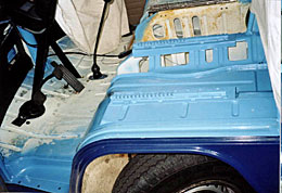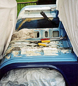 aus einem millitärbus der 3.generation entfernte ich das sitzgestell und die sitzschienen, (oben re) doch diese passen nicht auf anhieb in den bus der 2.generation also habe ich ausgemessen und mir bleche zuschneiden lassen und diese als unterlage für die sitzschienen eingeschweisst.